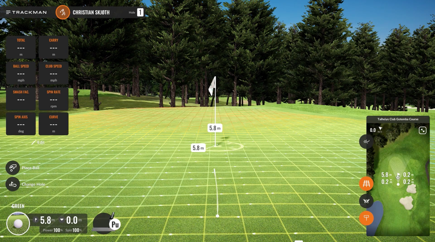 Det innebär att man puttar manuellt in i en cirkel om 2,4 m från hålet. När du kommer in i cirkeln så “får du sista putten” (dvs. det blir 1 putt därefter). Ett tips för puttningen i Trackman är att 0,1 m upp/nerför på green, brukar motsvara ca 1 m på längden. Dvs. har du en 8 m putt i 0,2 m nedförslutning bör du ta av 2 m på längden, alltså totalt 6 m.